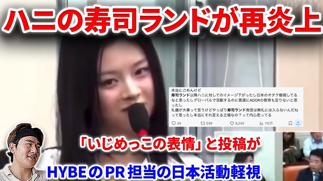 ハニの”寿司ランド”投稿”がネットで再炎上の理由!!HYBEのPRが日本活動を軽視したのか!?国会で証言するハニの表情が日本と海外では ミンヒジン【ニュジ BTS ILLIT Newjeans 炎上】