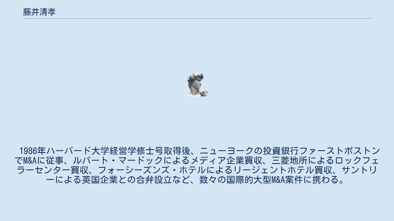 1986年ハーバード大学経営学修士号取得後、ニューヨークの投資銀行ファーストボストンでM&Aに従事、ルパート・マードックによるメディア企業買収、三菱地所によるロックフェラーセンター買収、フォーシーズンズ・ホテルによるリージェントホテル買収、サントリーによる英国企業との合弁設立など、数々の国際的大型M&A案件に携わる。