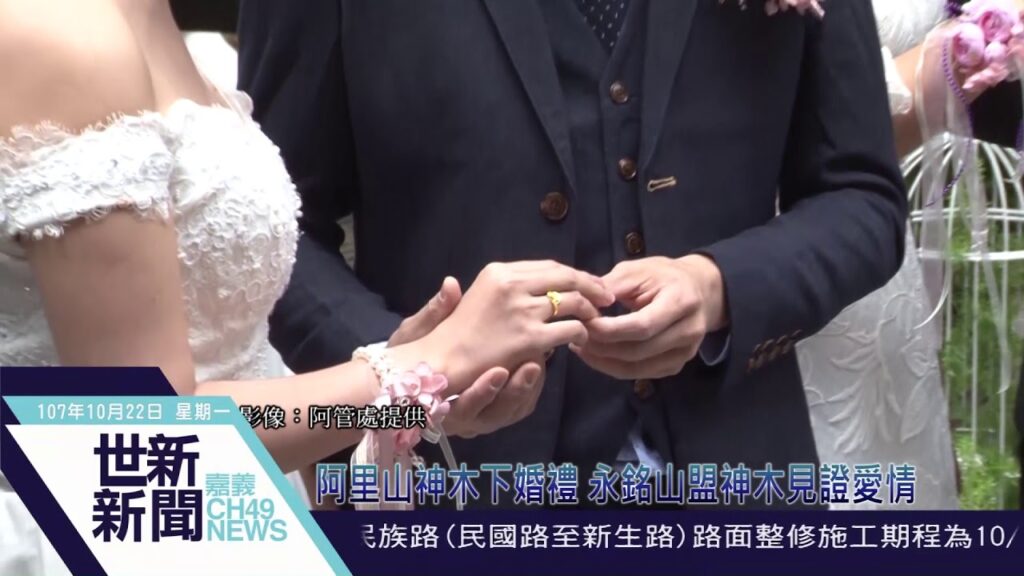 107年10月22日 (一) 世新新聞 阿里山神木下婚禮 永銘山盟神木見證愛情 執子之手與子偕老,由著千年神木見證愛情,15對國內外新人,透過阿里山國家風景區管理處舉辦的阿里山神木下婚禮,給有情人的山盟海誓,好姻緣結成連理,完成證婚儀式。 -